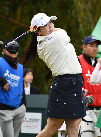 女子ゴルフ・樋口久子・三菱電機レディース第2日。ツアー未勝利の25歳、後藤未有が8バーディー、1ボギーの65をマークし、通算11アンダーとして単独トップに立った=1日、埼玉・武蔵丘GC 【時事通信社】
