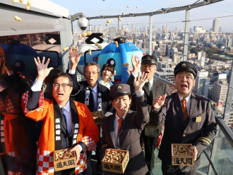 恒例行事「通天閣節分福豆まき」が2月1日、通天閣(大阪市浪速区)で行われた。