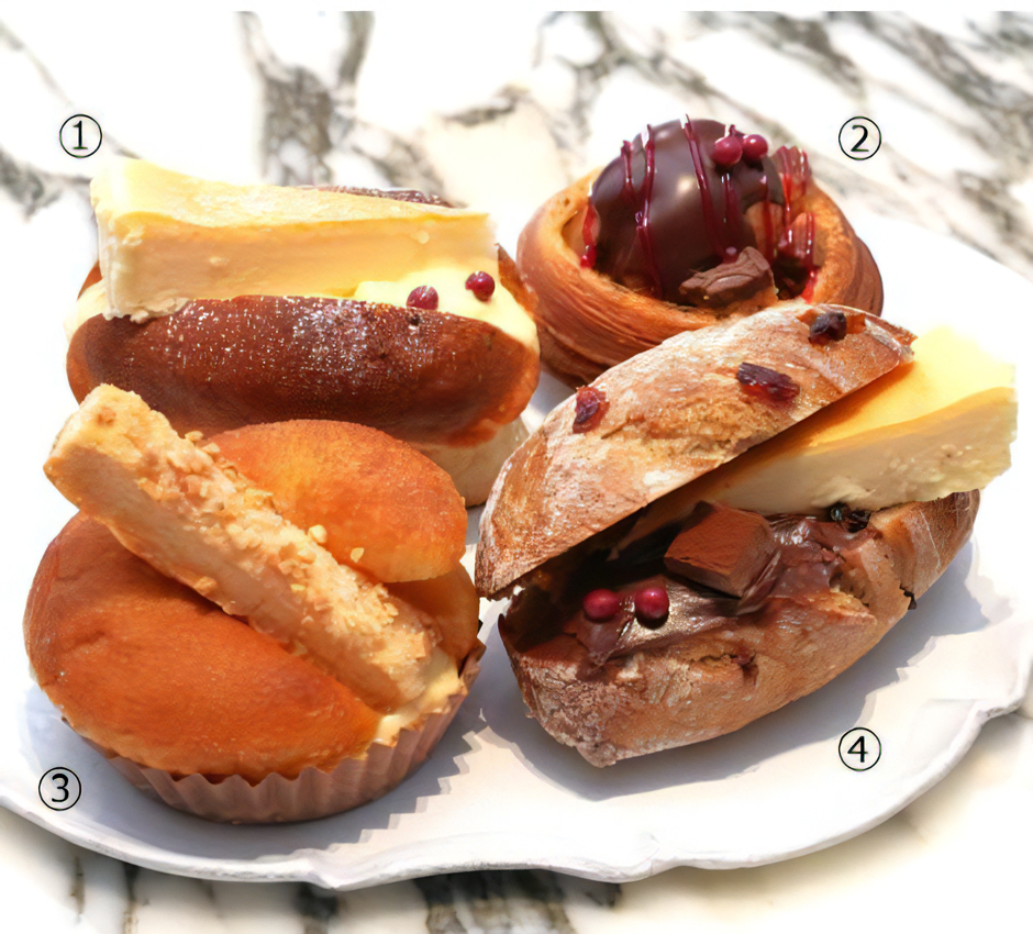 ①パリゴの「ミルククリーム」×ポアールの「帝塚山チーズケーキ」1個519円、②パリゴの「デニッシュ」×ポアールの「プチエクレア」1個519円、③パリゴの「シナモンのブリオッシュ」~ポアールのアップルパイ風~1個540円、④パリゴの「サワーチェリーのセーグル」×ポアールの「帝塚山チーズ&ショコラ」1個562円 12月3日・4日出店