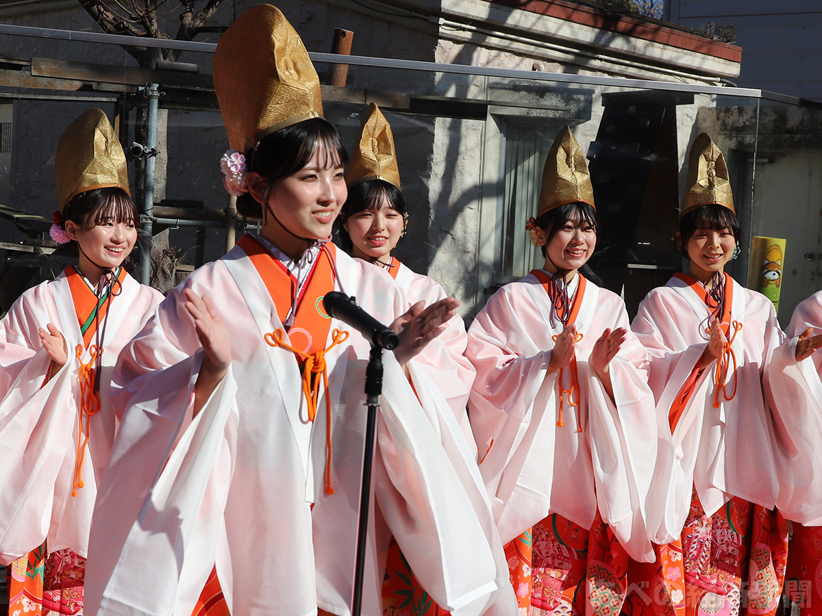 天王寺動物園(大阪市天王寺区)で1月6日、今宮戎神社(浪速区)の「十日戎(えびす)」の福娘が同園に福笹(ふくざさ)を贈る贈呈式が行われた。