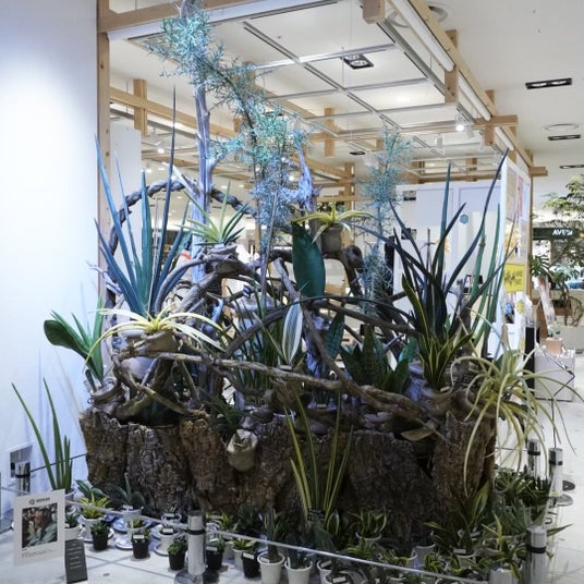 「花宇宙」珍奇植物ビザールプランツのパイオニア、西畠勲造が代表の特殊花材と観葉植物の専門店。8階 コミュニテ イパーク正面に植物ディスプレイを展示中。