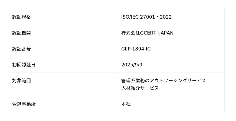 この認証取得により、経理アウトソーシングサービス「みんなの経理部」および人材紹介サービス「即戦力サーチ」において、お客様からお預かりする重要な情報資産に対する、一貫性のある強固な情報セキュリティ管理体制が国際標準に基づいて構築・運用されていることが客観的に証明されました。