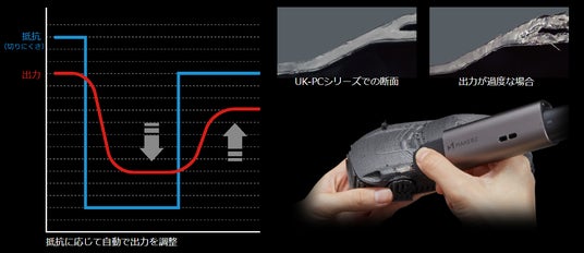 UK-PCシリーズは材質の抵抗(切りにくさ)に応じて自動で出力を調整し、切りやすい材質に対しては出力が自動抑制されるため、材質に応じた最適な出力で美しい切断が可能となります。