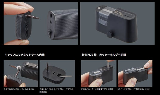また、専用ケースの中には替え刃20枚カッターホルダーを同梱。本体キャップは刃具交換用のレンチ付きマグネットツールとなっており、刃具の交換も安全に安心して行っていただくことができます。