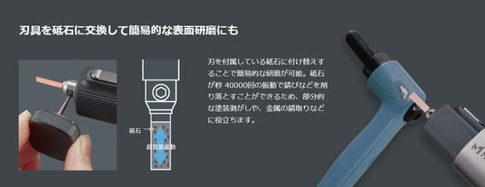 刃具を付属の砥石に付け替えすることで簡易的な研磨が可能です。砥石が秒40000回の振動で錆びなどを削り落とすことができるため、部分的な塗装剥がしや、金属の錆取りなどに役立ちます。
