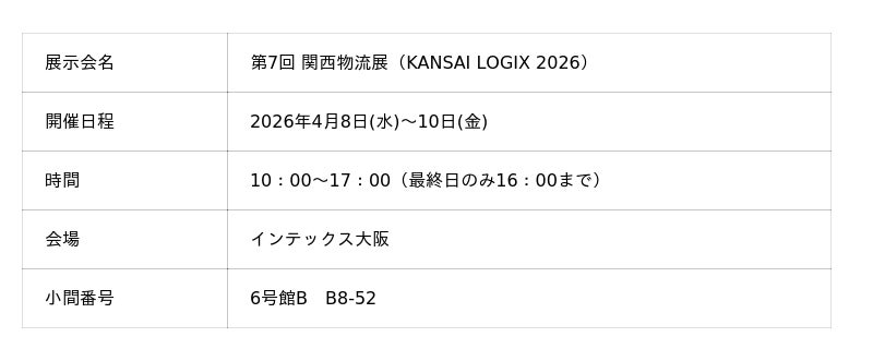 株式会社シーアールイー(代表取締役社長COO/亀山忠秀 本社/東京都港区)は、2026年4月8日(水)から10日(金)までの3日間、インテックス大阪で開催される『第7回関西物流展(KANSAI LOGIX 2026)』に出展いたします。
